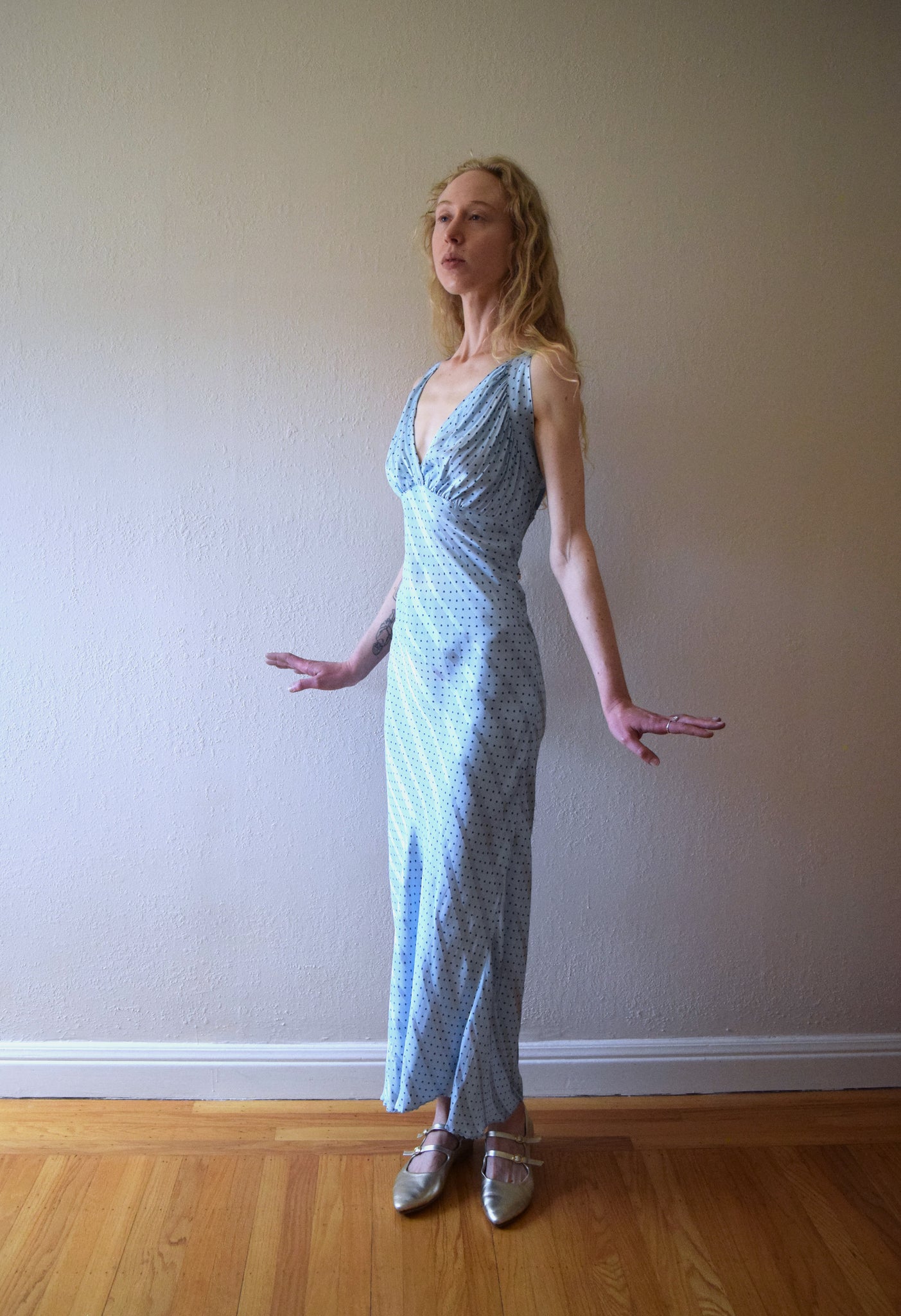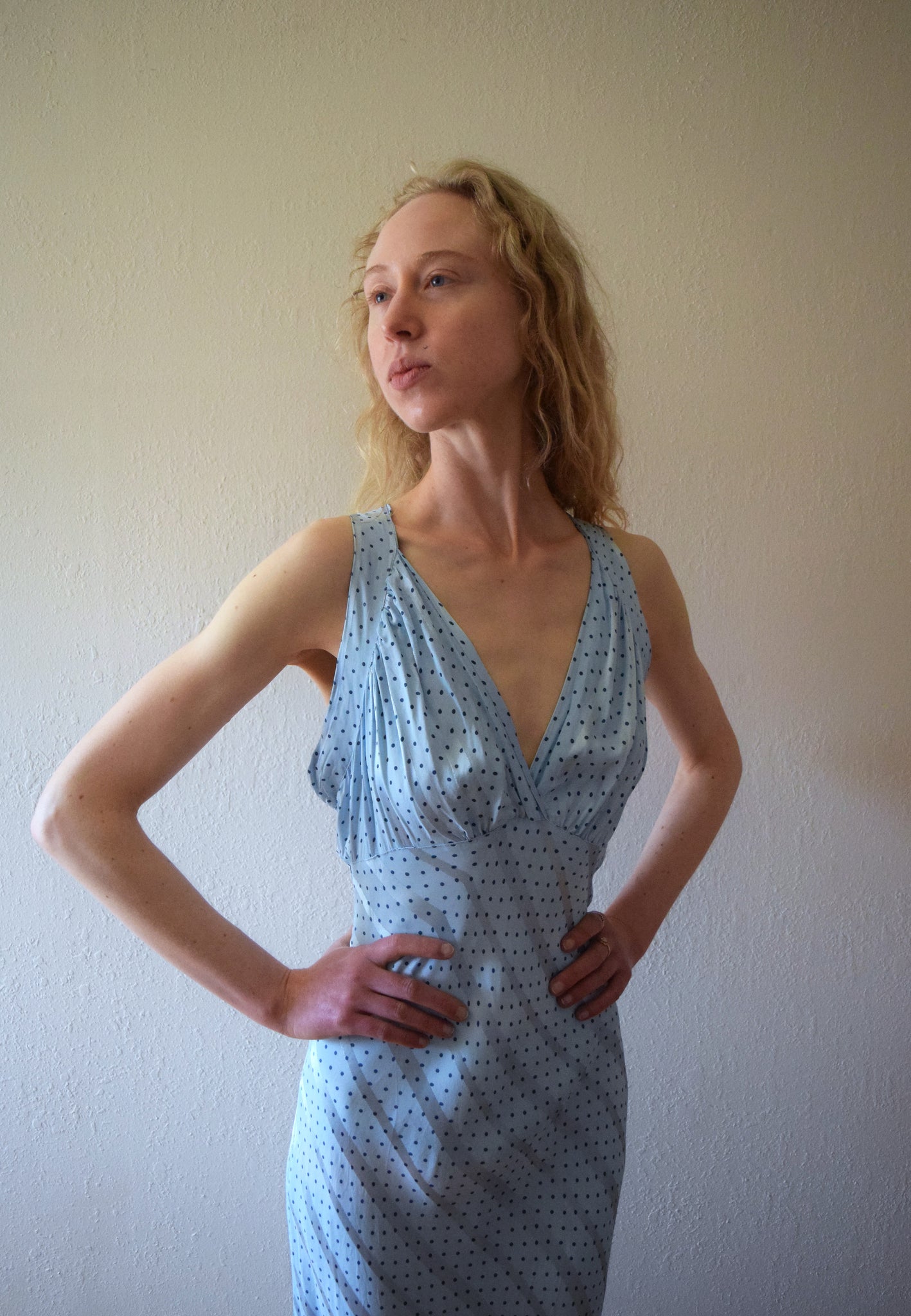 A vintage polka dot bias cut nightgown (perfect as a dress) from the late 1930s to early 1940s. It has gathering in the bust and a keyhole opening on the back. The fabric is a blue rayon satin, and it also has a subtle striped pattern in addition to the polka dots.
