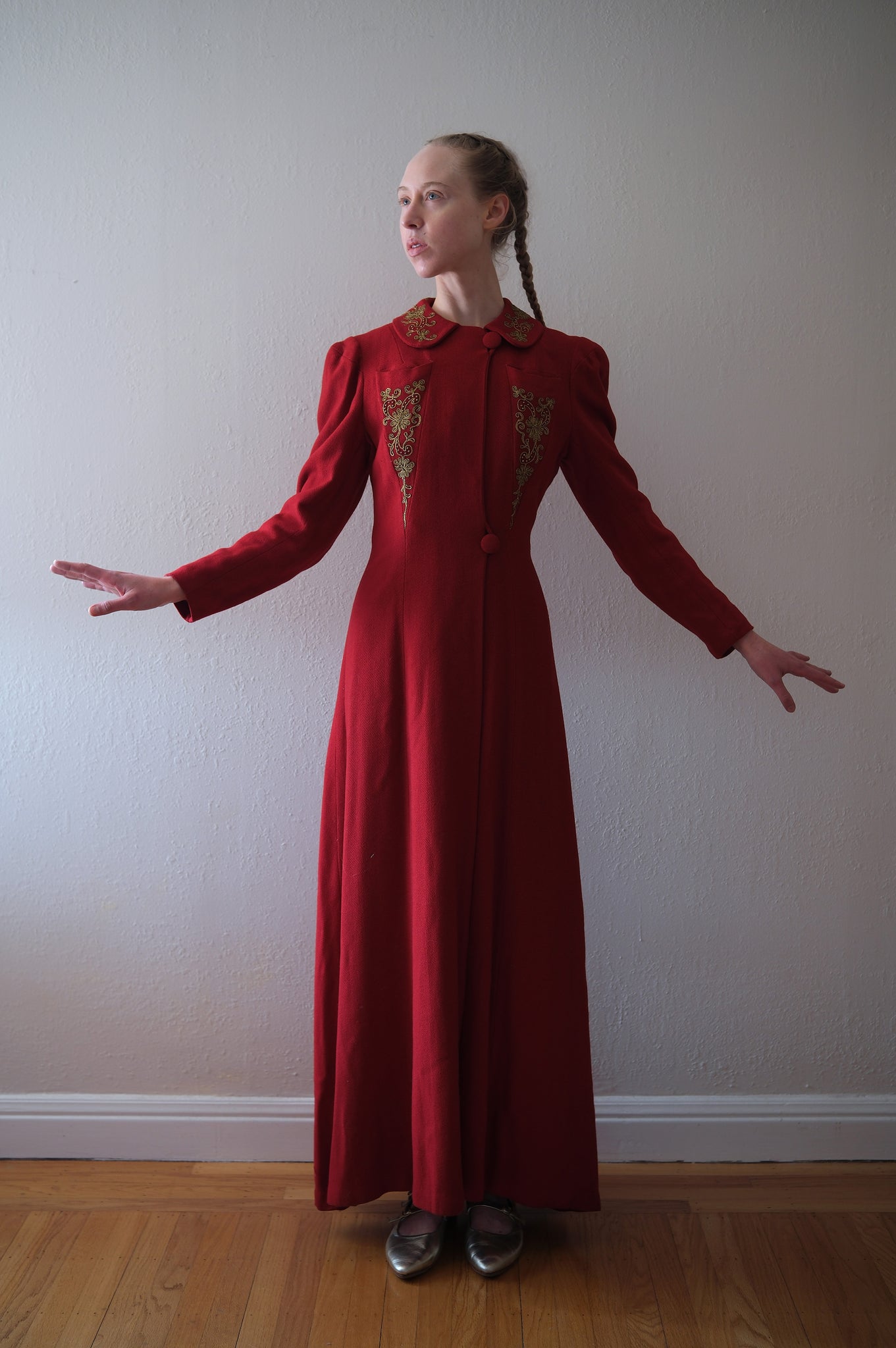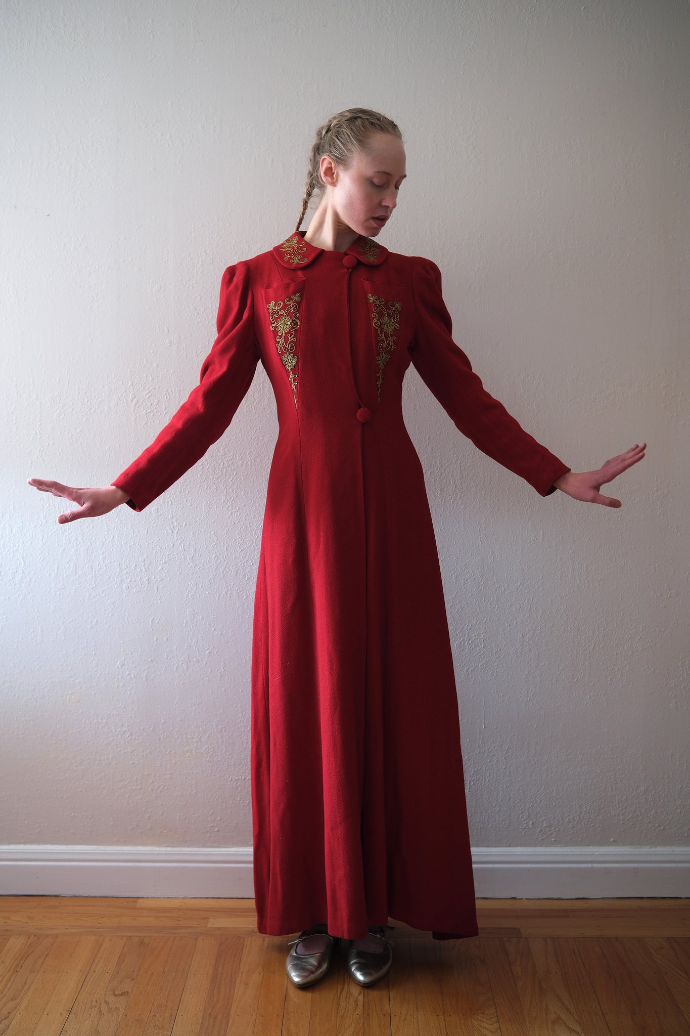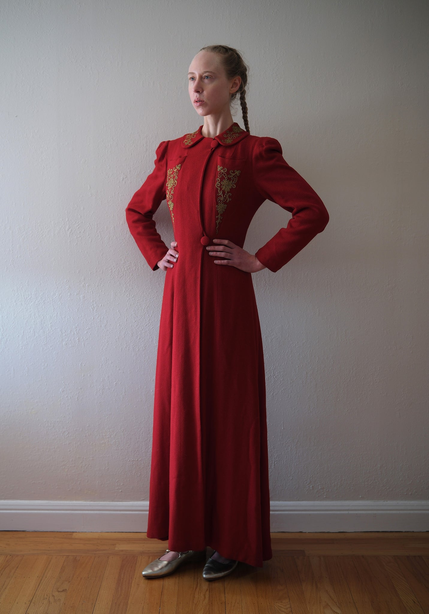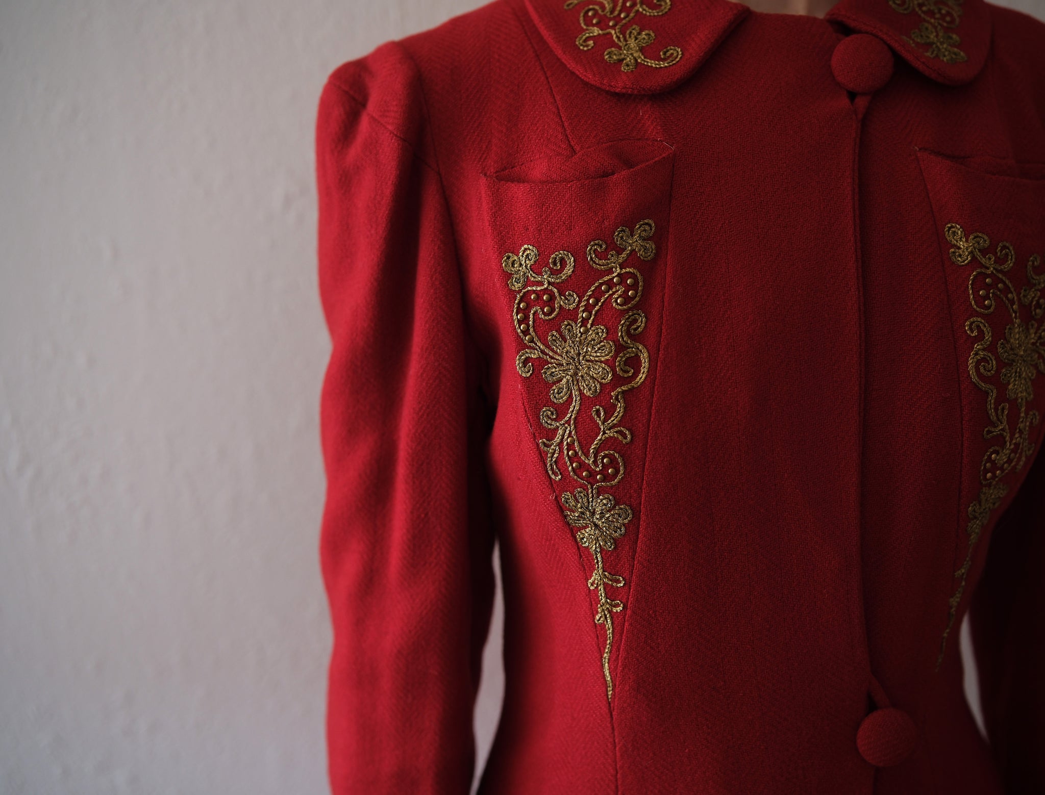 A vintage late 1930s/early 1940s wool coat with slightly puffed sleeves and gold studs and soutache trim on the collar and front bodice. The coat is fully lined and fastens with an interior tie and a button at the neckline and waist. The red exterior fabric is substantial weight wool with a herringbone weave.