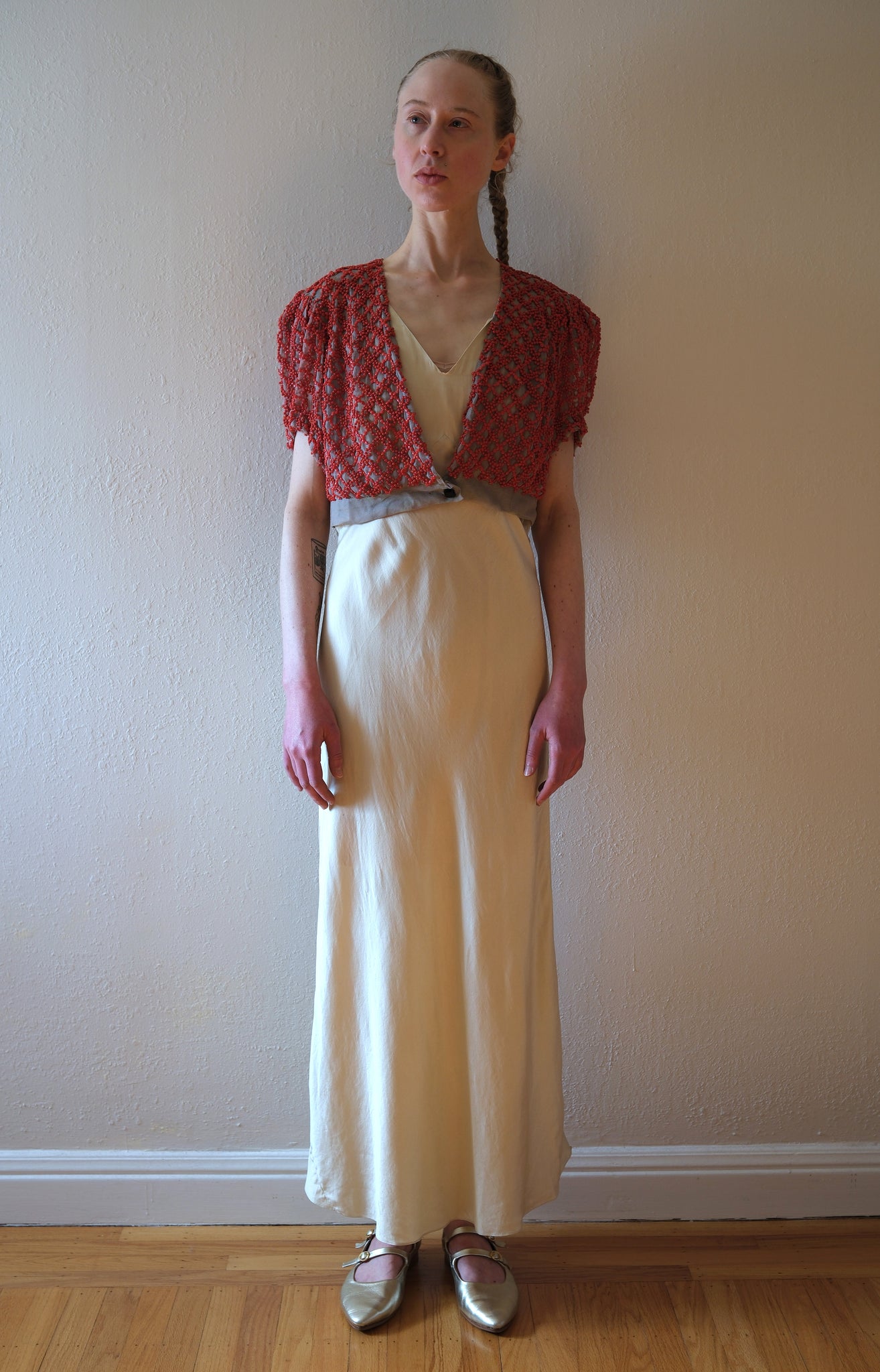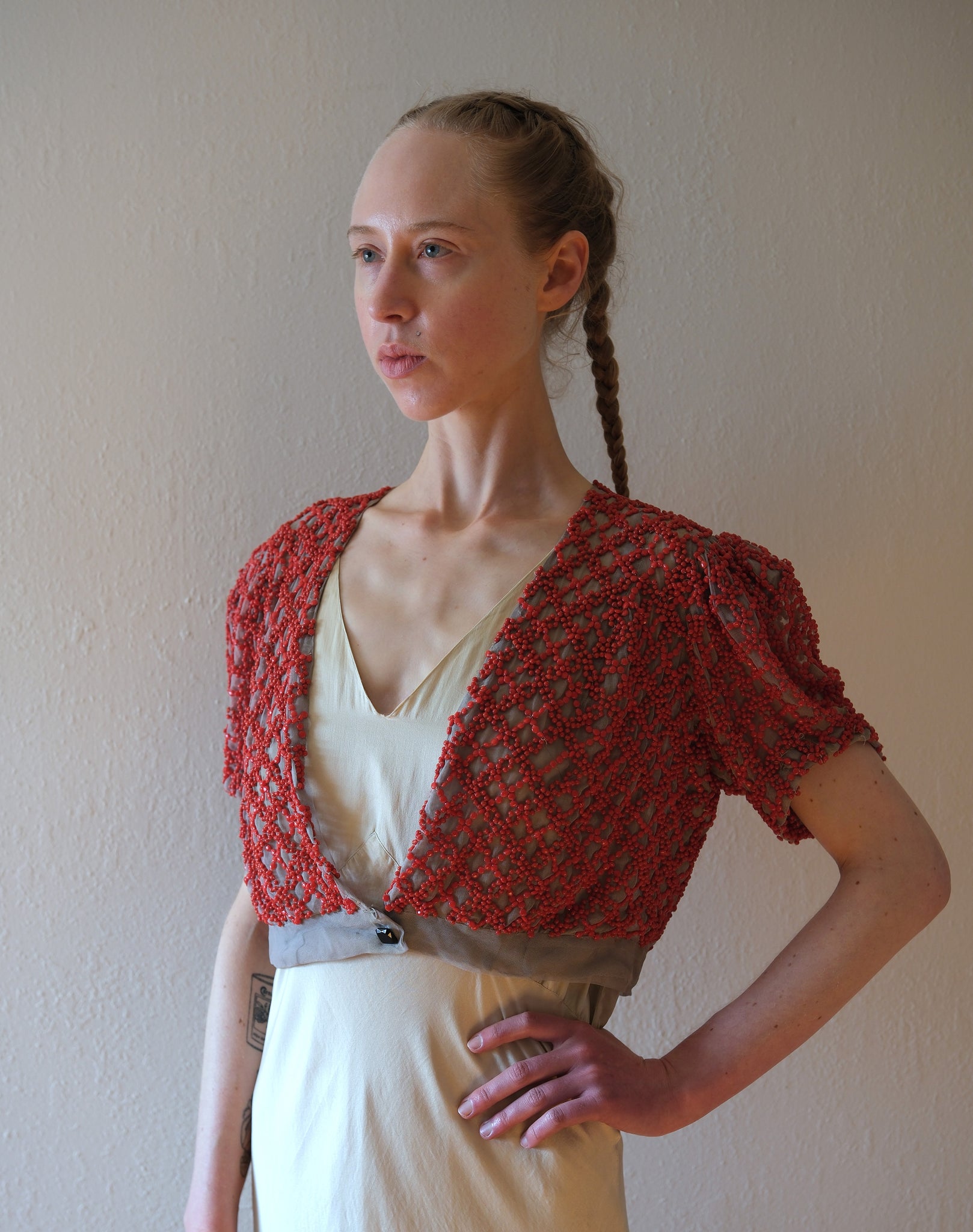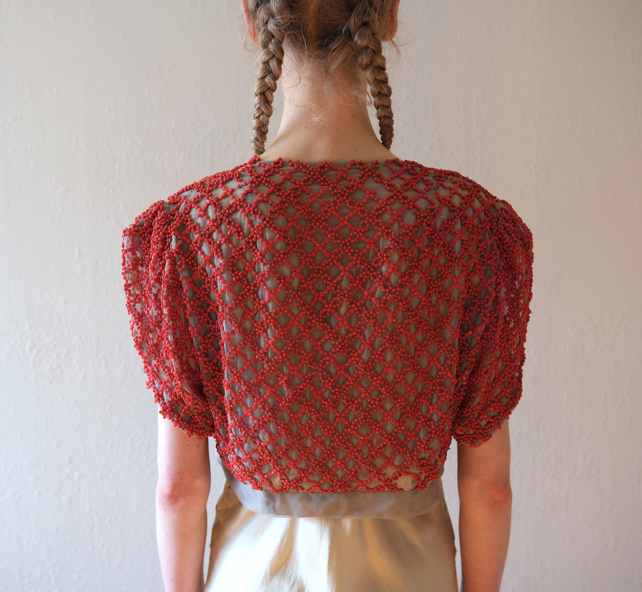 A vintage late 1930s/early 1940s fine net bolero covered in a pattern of tiny red beads. The jacket has puffed sleeves. It also has a black decorative button at the waist and fastens with a snap. The gray net fabric is likely rayon.