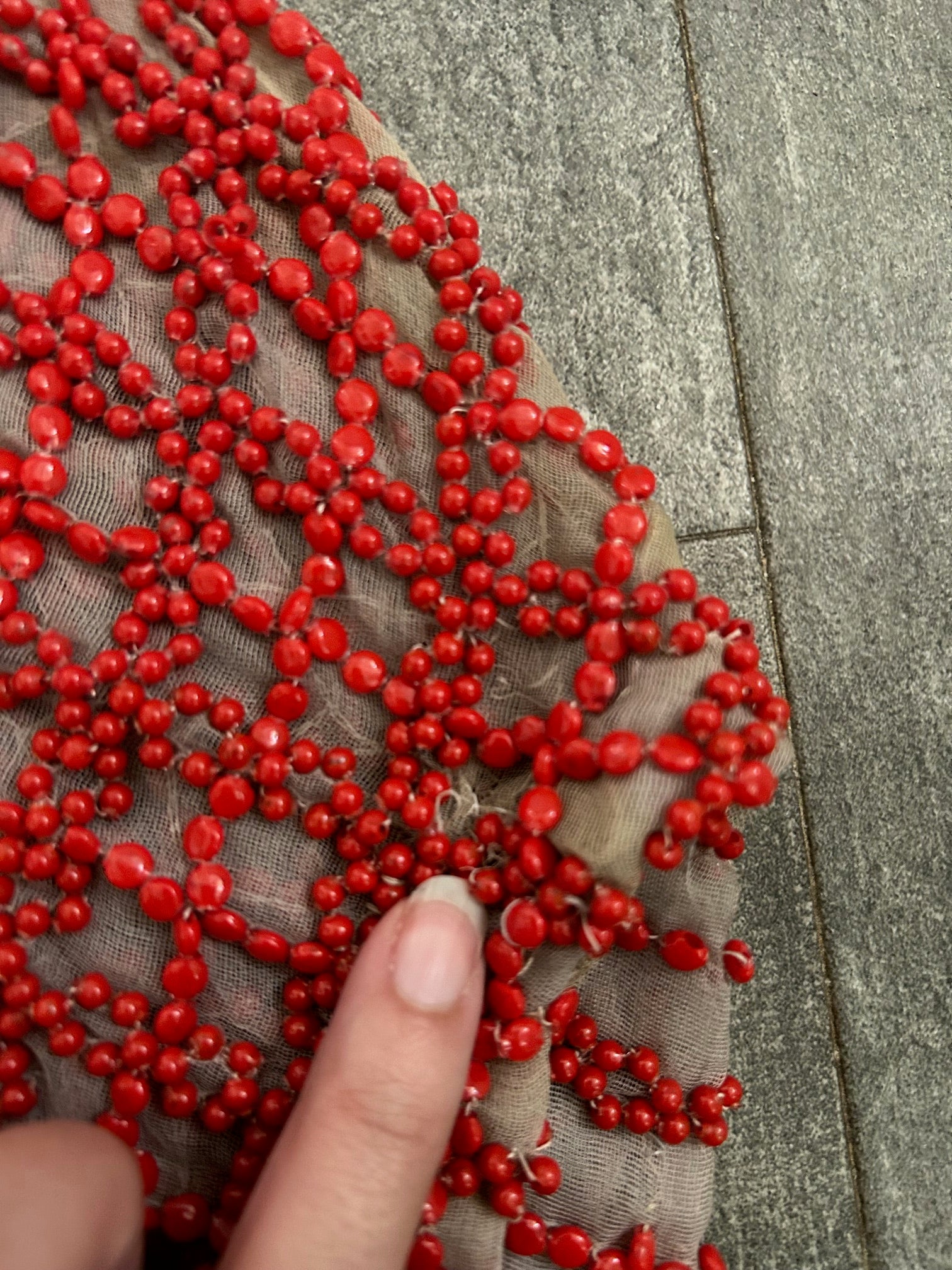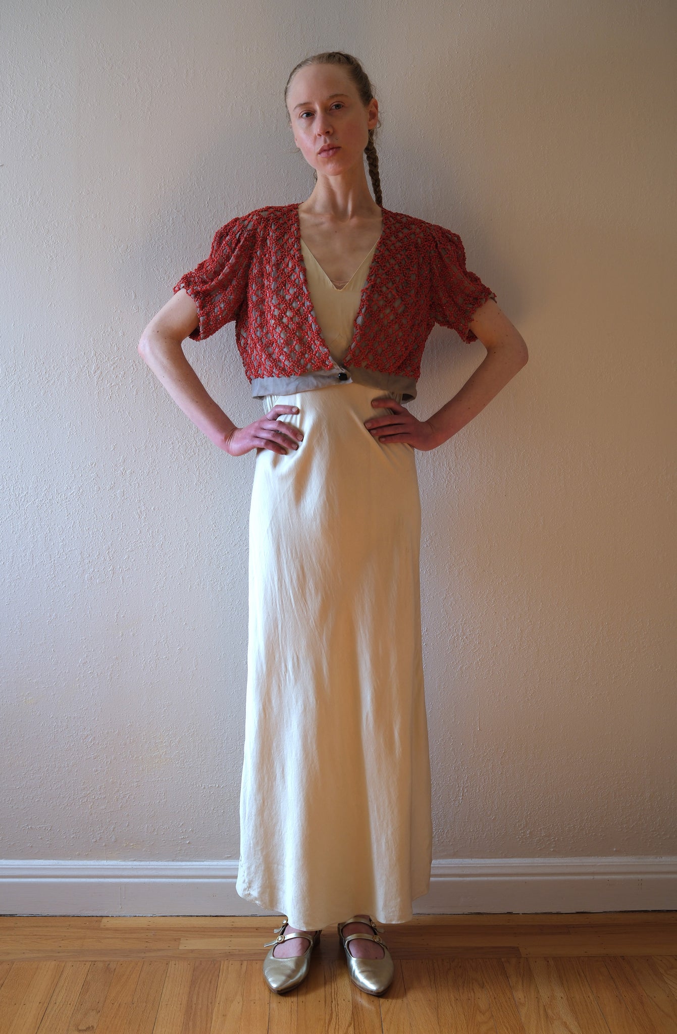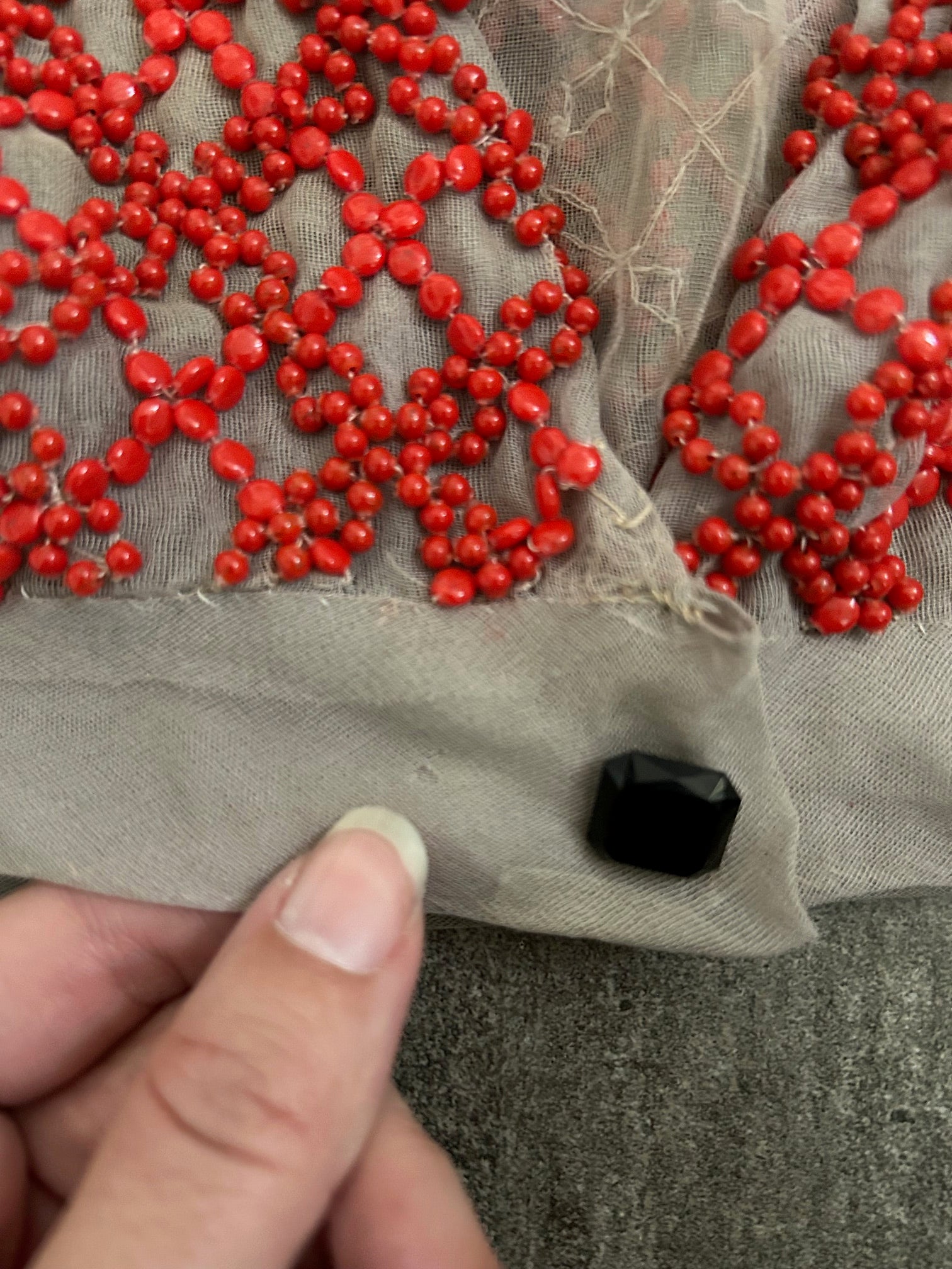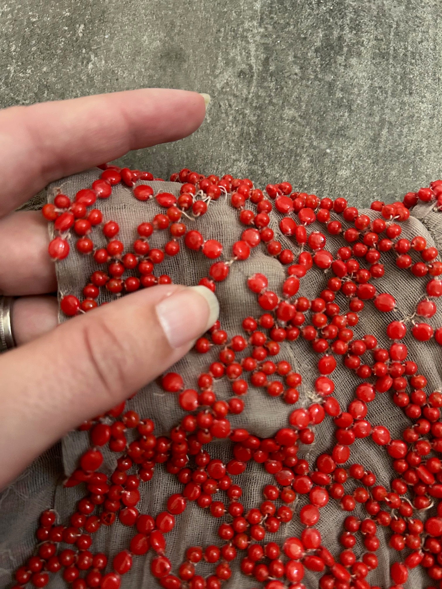 A vintage late 1930s/early 1940s fine net bolero covered in a pattern of tiny red beads. The jacket has puffed sleeves. It also has a black decorative button at the waist and fastens with a snap. The gray net fabric is likely rayon.