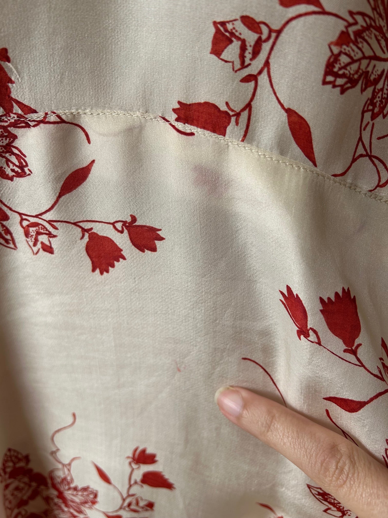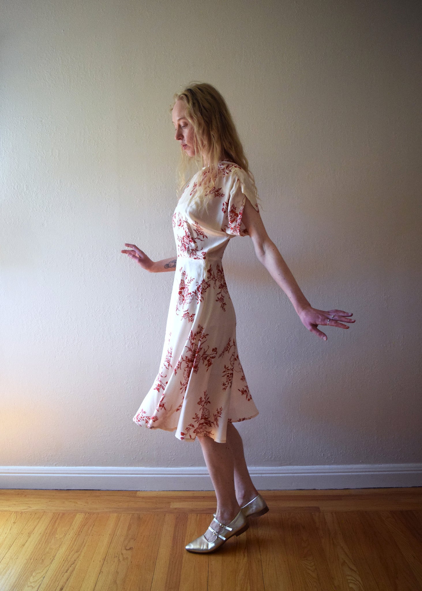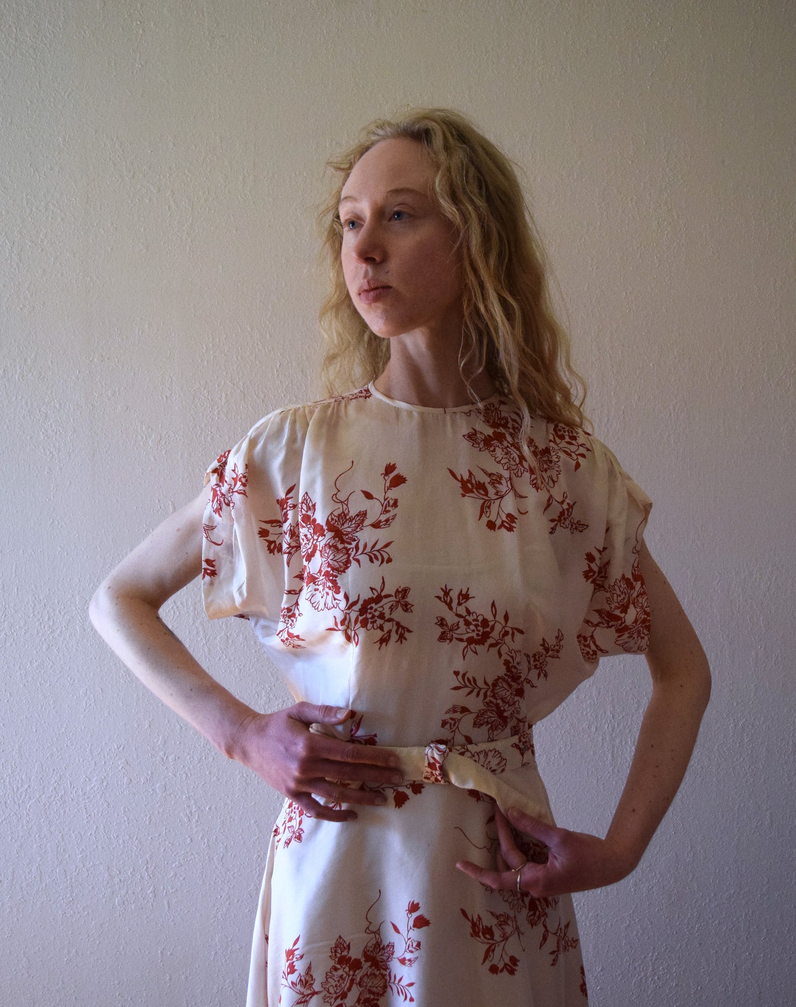 A vintage 1940s silk dress with a floral print in dark pink on a cream background. The dress has a slightly flared skirt and gathering on the top of each shoulder/sleeve. The dress fastens with a side metal zipper and also has a separate adjustable fabric-covered belt. The fabric feels like a lightweight tissue silk.