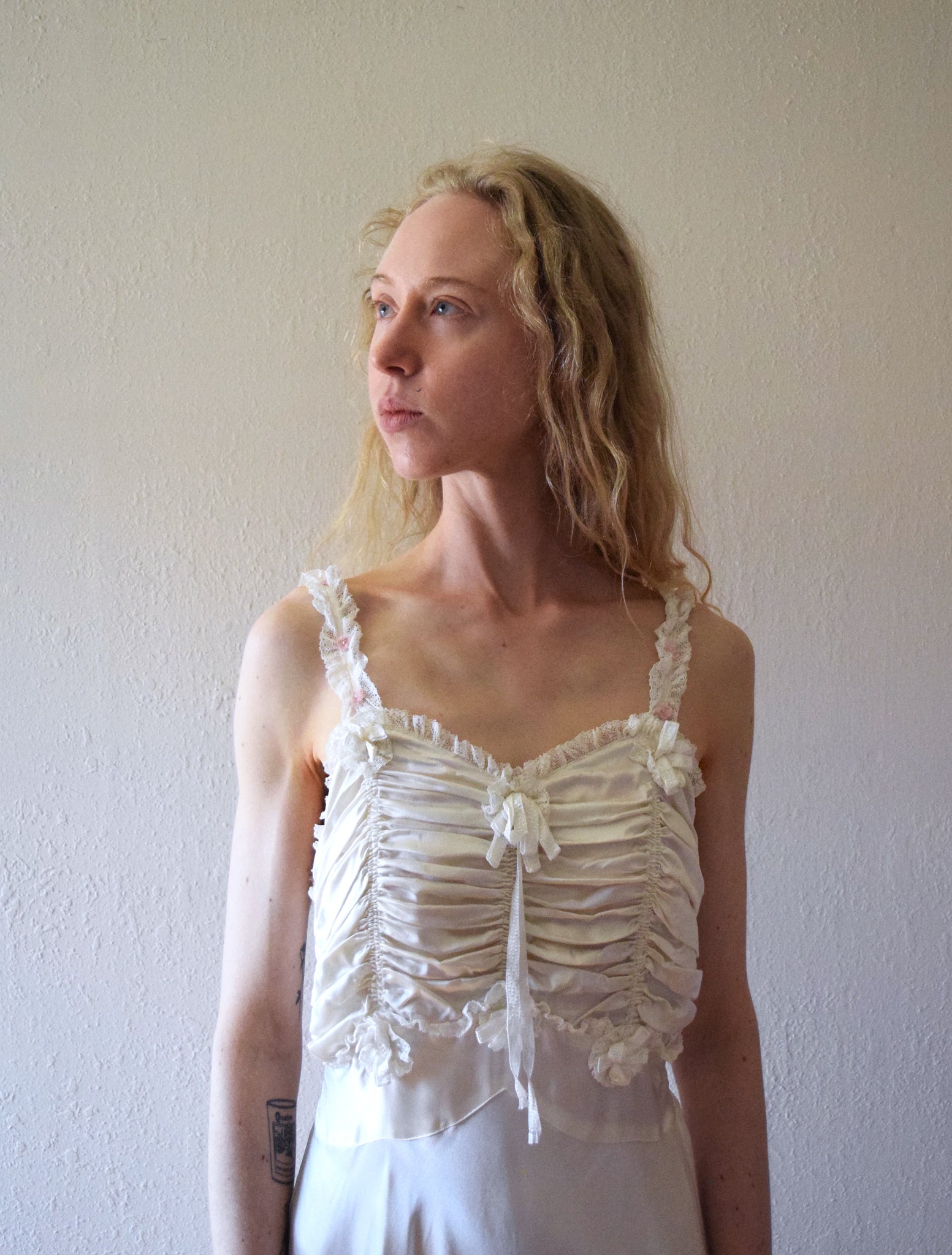 A late 1930s satin gown with a full skirt and gathered bodice. The skirt of the gown has lace trim and comes up slightly in the front. The bodice of the gown has lace trim as well as decorative lace bows and flowers made from lace and ribbon. The straps have lace trim as well as tiny pink decorative flowers. The gown fastens with a side snap and has attached waist ties. The fabric feels like rayon satin and is a darker ivory/lighter cream in color.