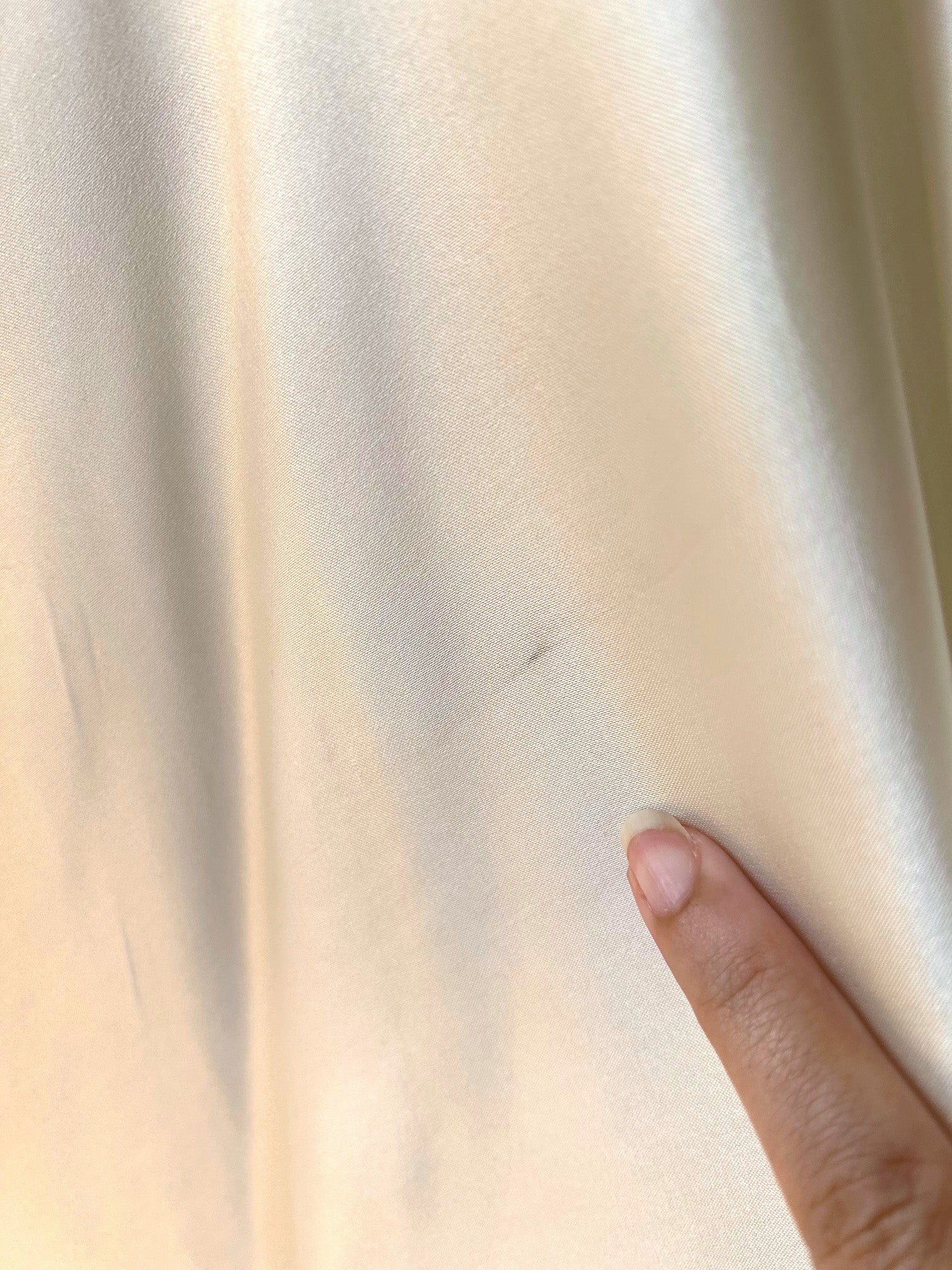 Condition: Very good. Skirt of gown has a few dark marks then didn't come out when I cleaned it. There's one mark approximately midway down the front skirt that is noticeable if you're looking for it, but because of the fulness of the skirt, this mark and the others don't jump out. Back bodice of gown has a couple faint marks that lightened when I cleaned the gown but didn't fully lift. These don't jump out because of their location and faintness. Dress presents beautifully.