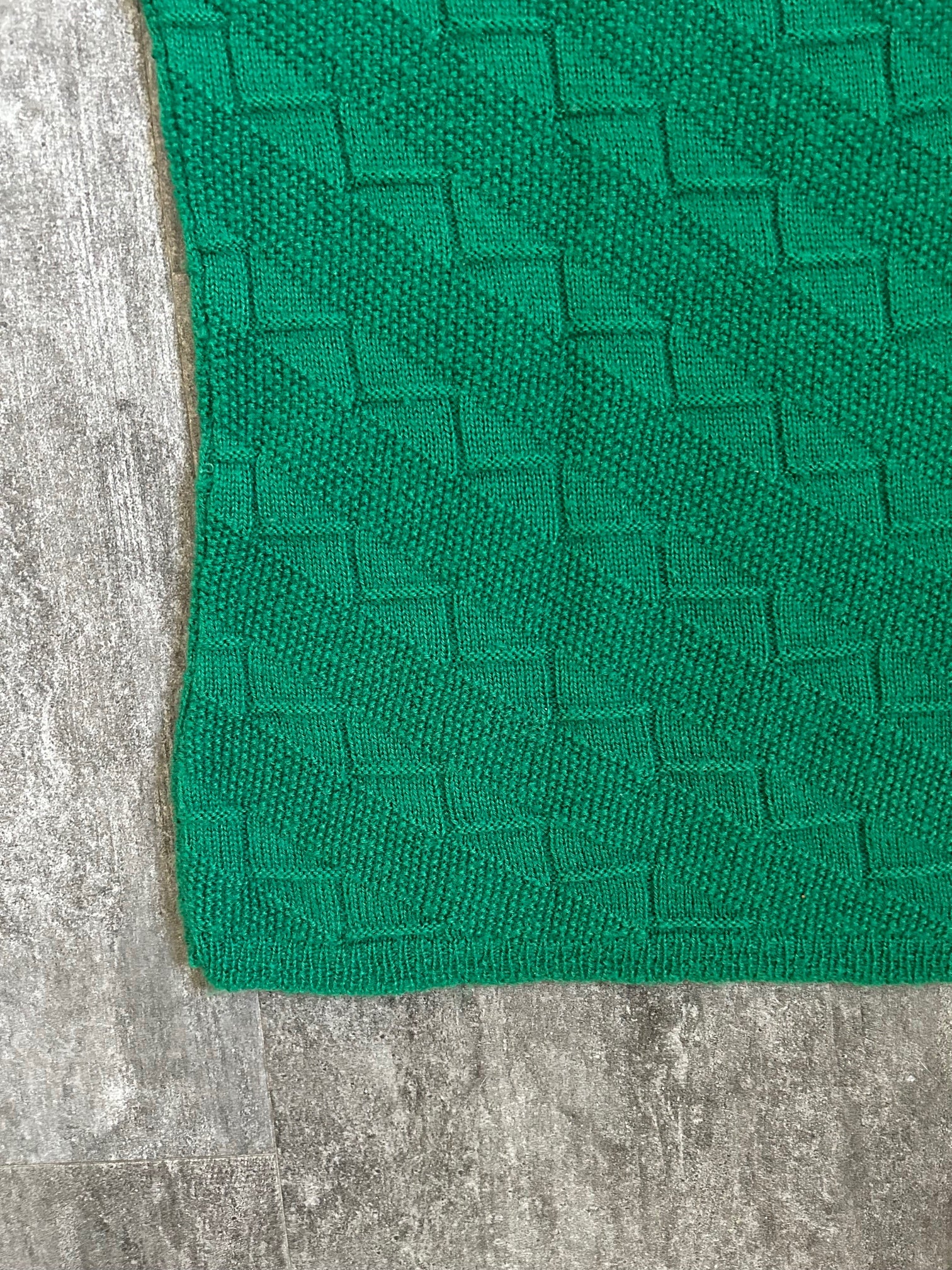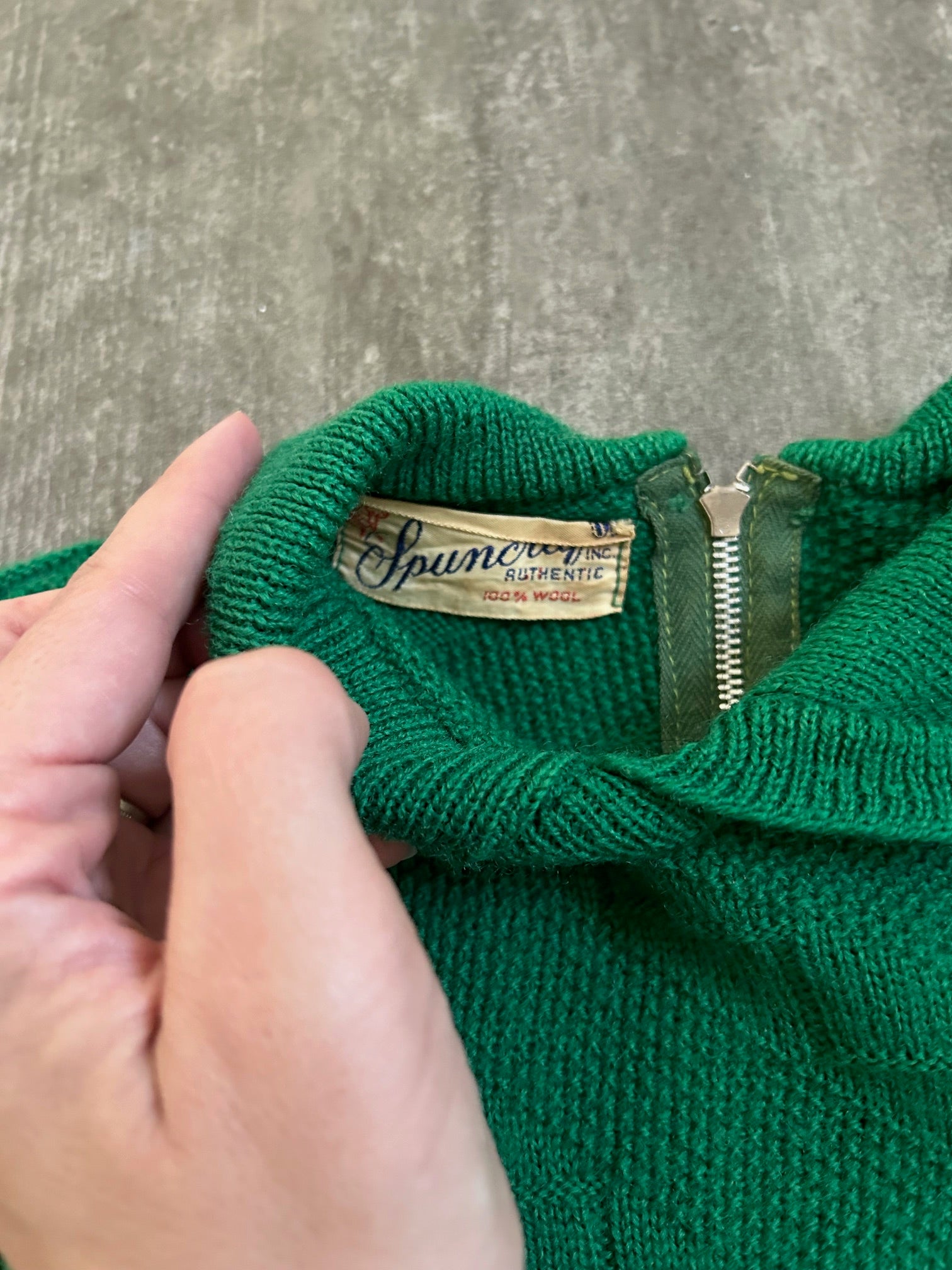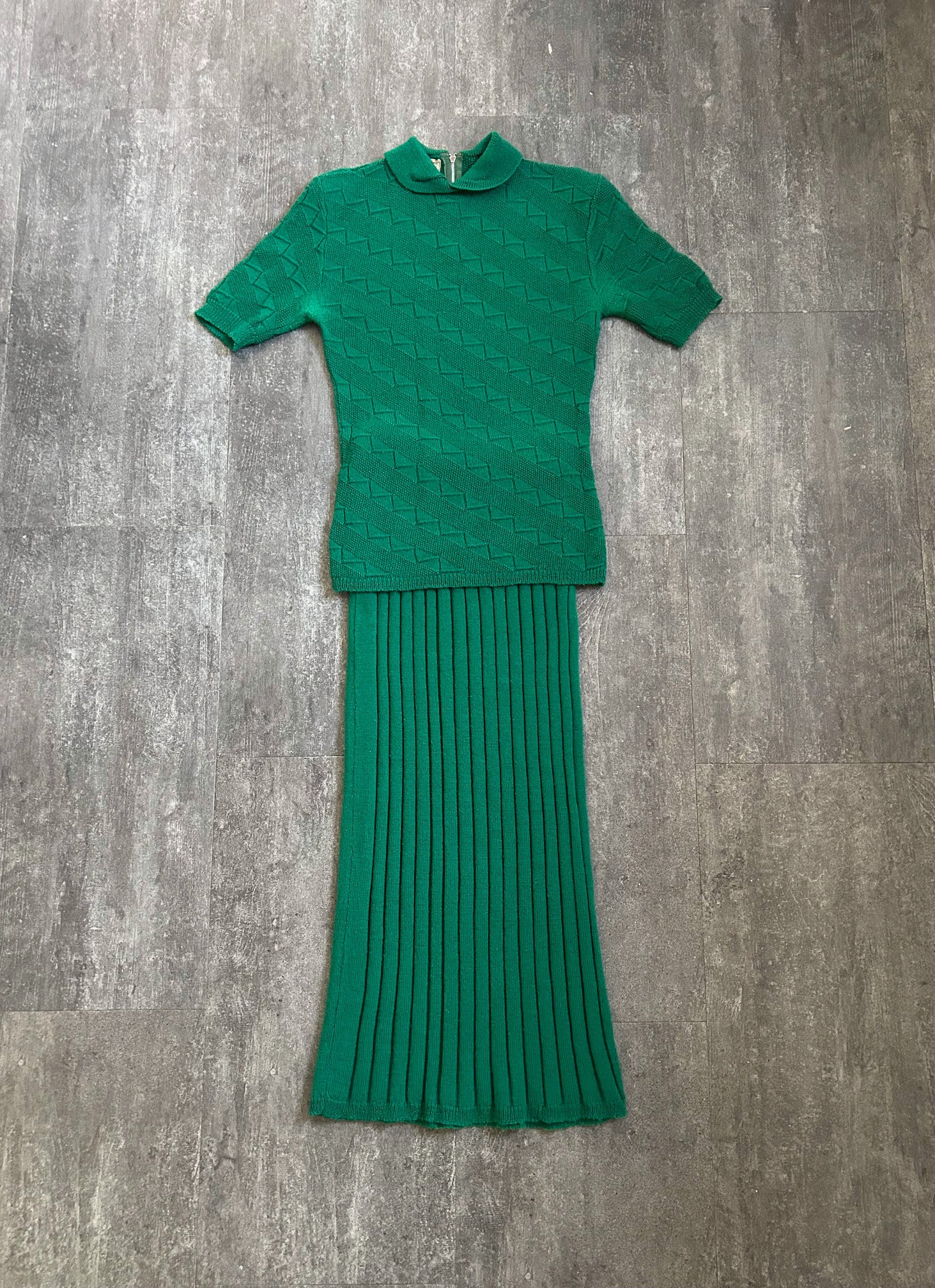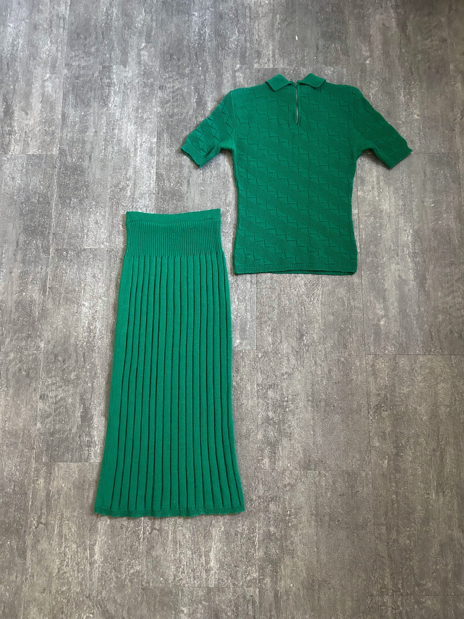 A vintage 1940s knit set in emerald green. The top is a textured knit with a zig zag pattern. It also has a small collar, small shoulder pads, and back neck zip. The skirt is a ribbed knit with a narrow ribbed pattern near the waist. The knit fabric is wool, and the maker is "Spuncraft"