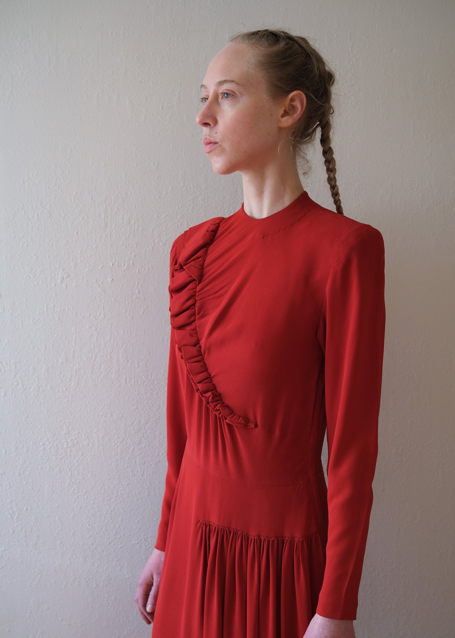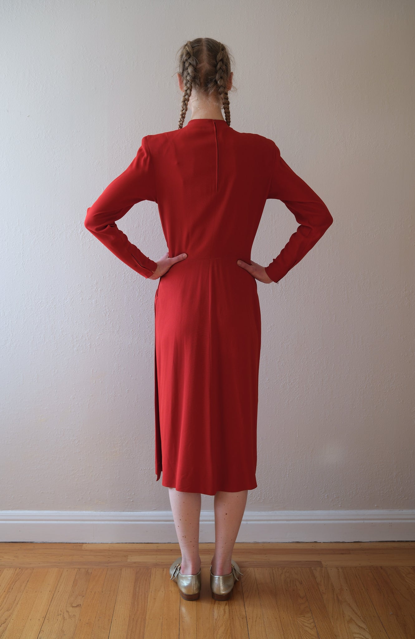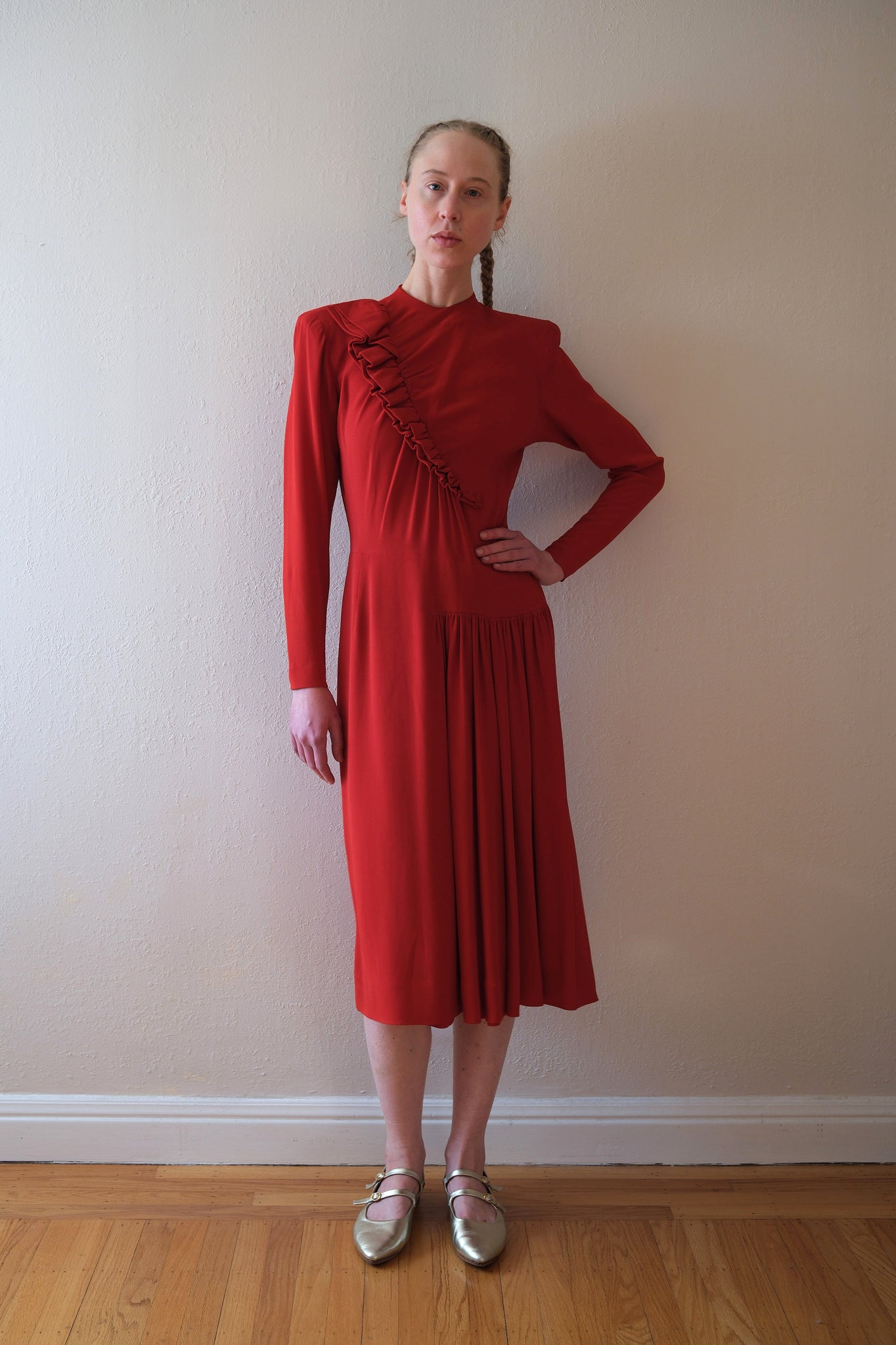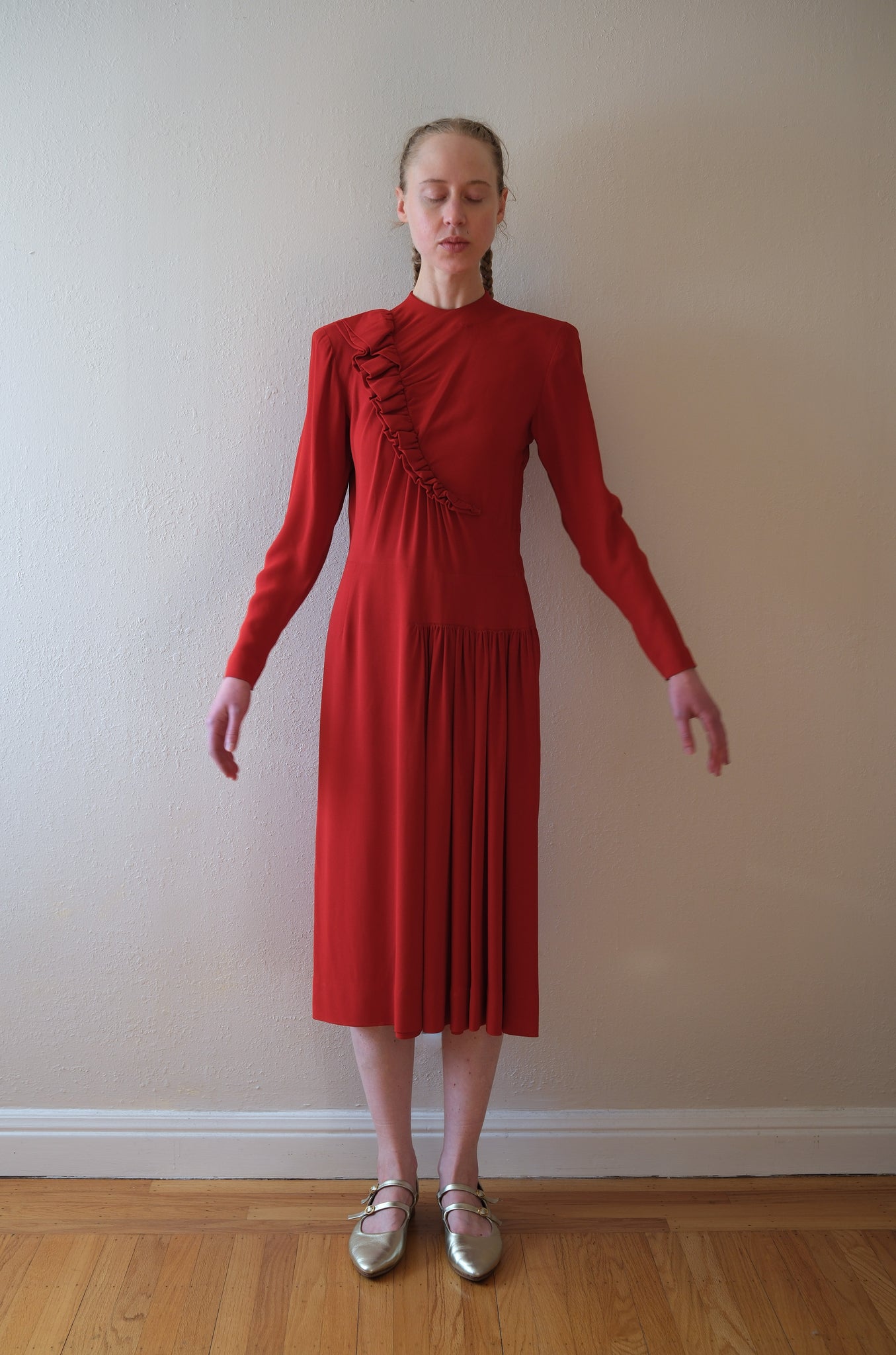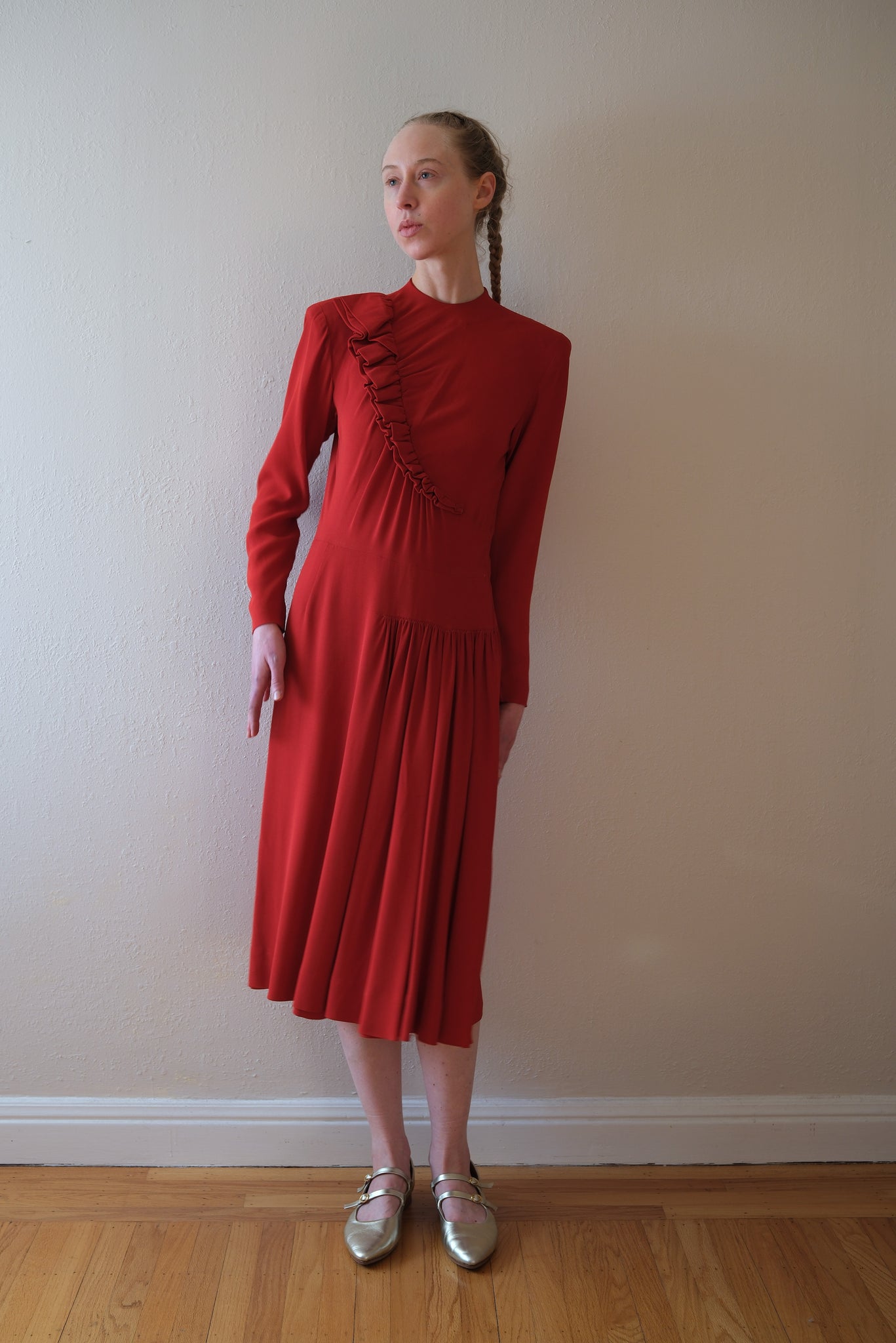 A vintage 1940s dress with shoulder pads, a ruffle across the front bodice, and a gathered fabric panel on the side hip. The dress fastens with zippers at the ends of the sleeves, a back neck zip, and a side metal zip. The substantial weight, twill red fabric feels like rayon. The maker is Foxbrownie (a higher-end design house in the 1940s).