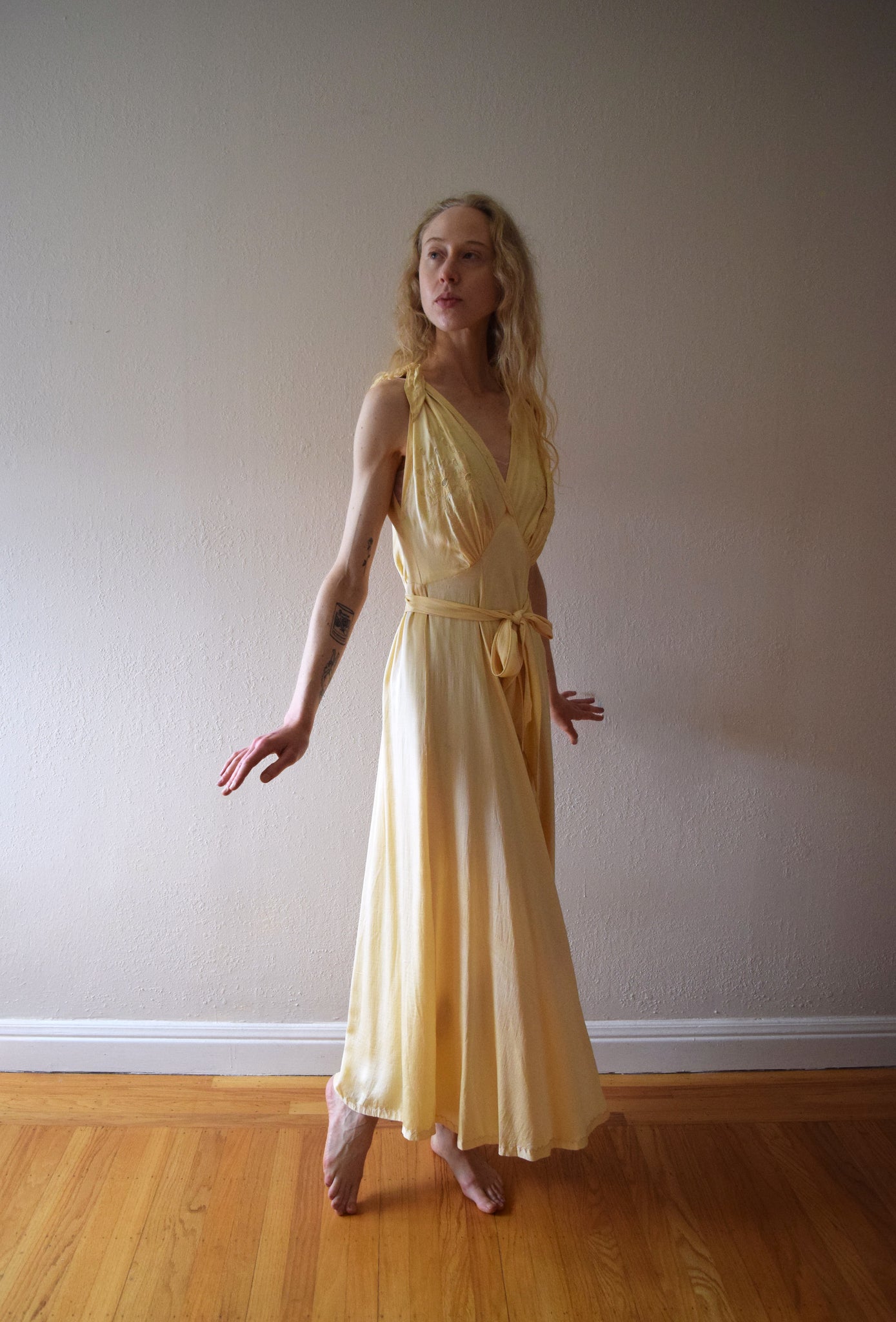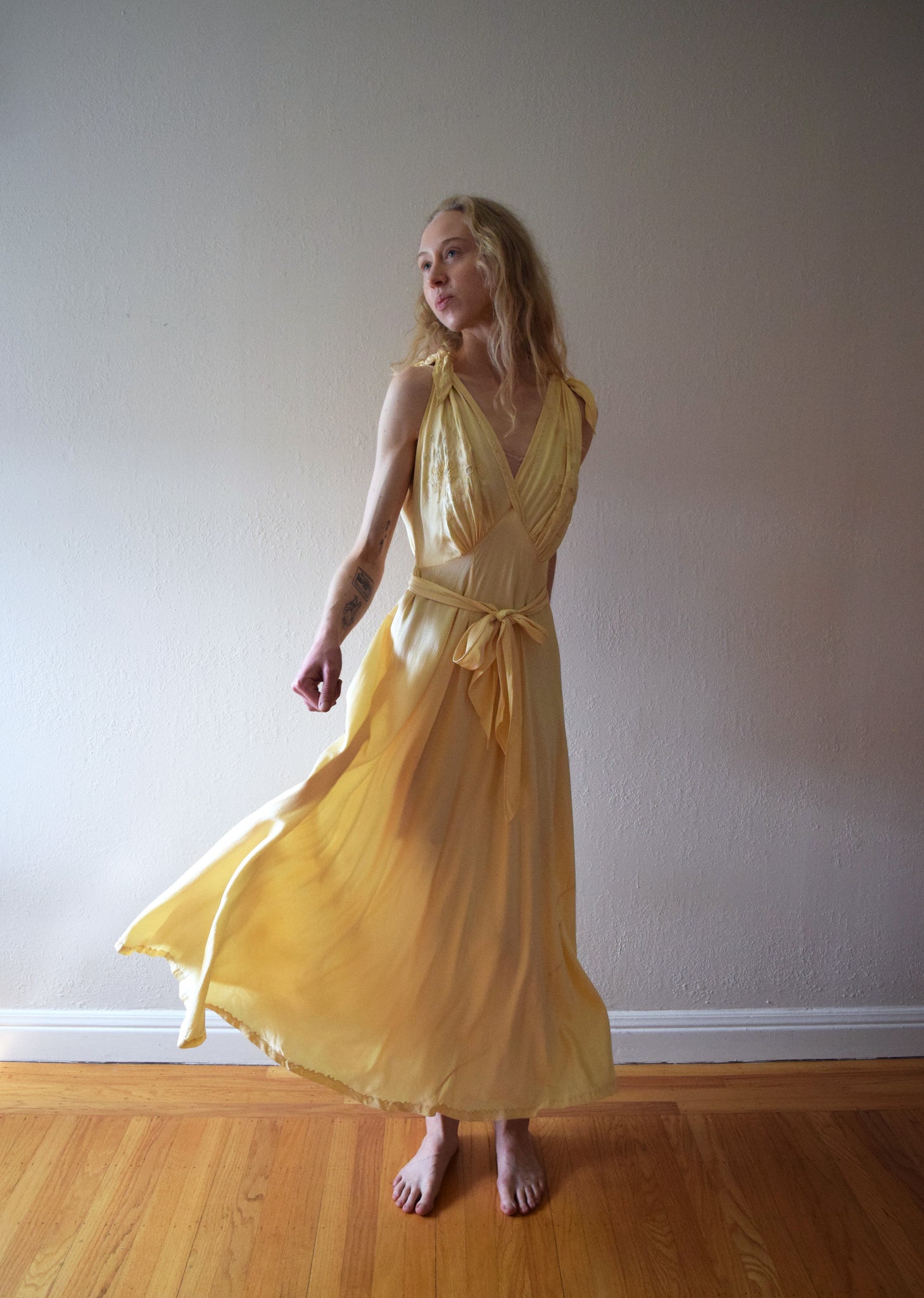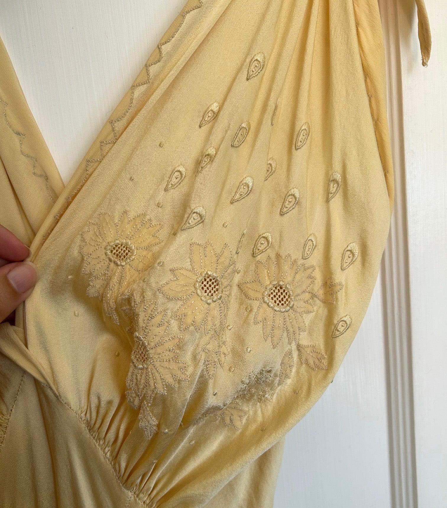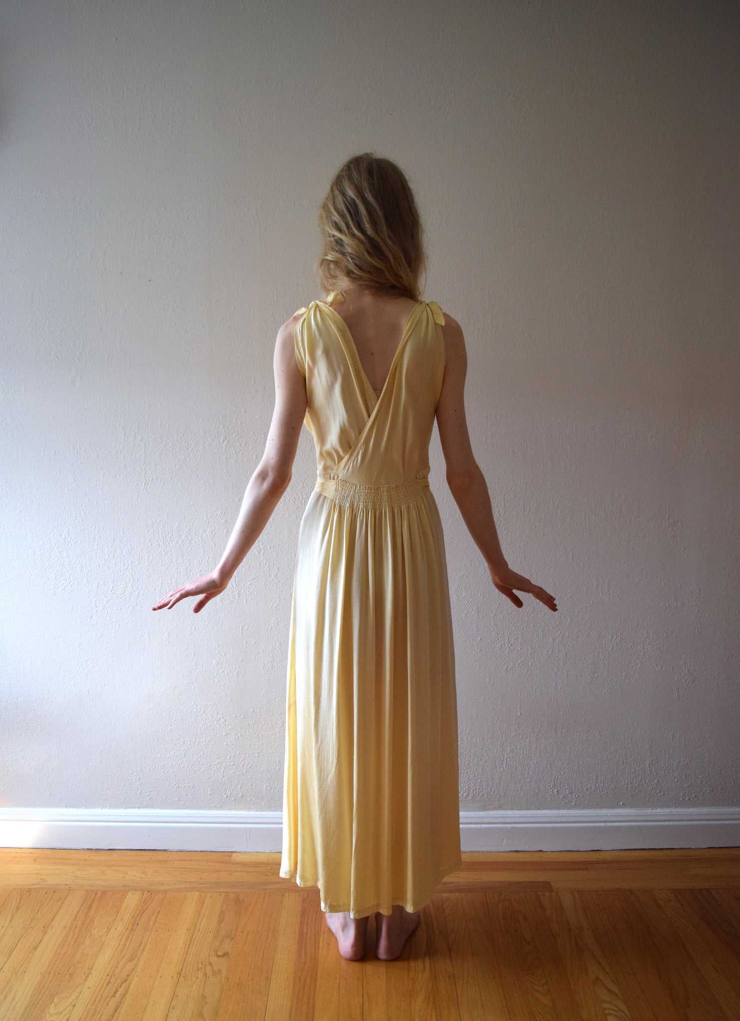 A vintage nightgown from the late 1940s (possibly early 1950s). It has floral appliqué and embroidery on the gathered front bodice, as well as appliqué and embroidery around the neckline and at the hem. The gown has an open skirt with two front inverted pleats. It has smocking at the back waist with two attached waist ties, and it ties at the shoulders. The fabric is a yellow silk satin.