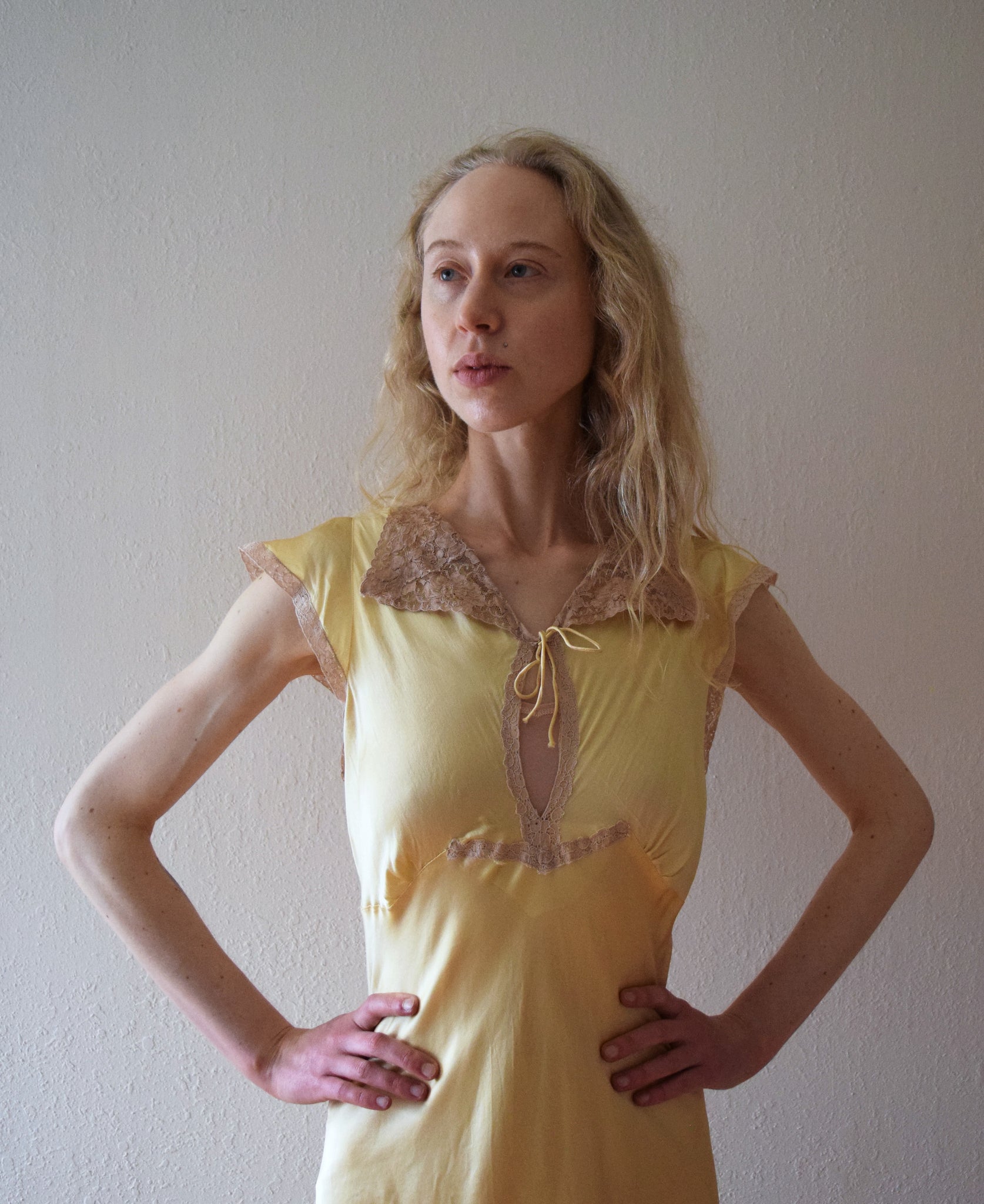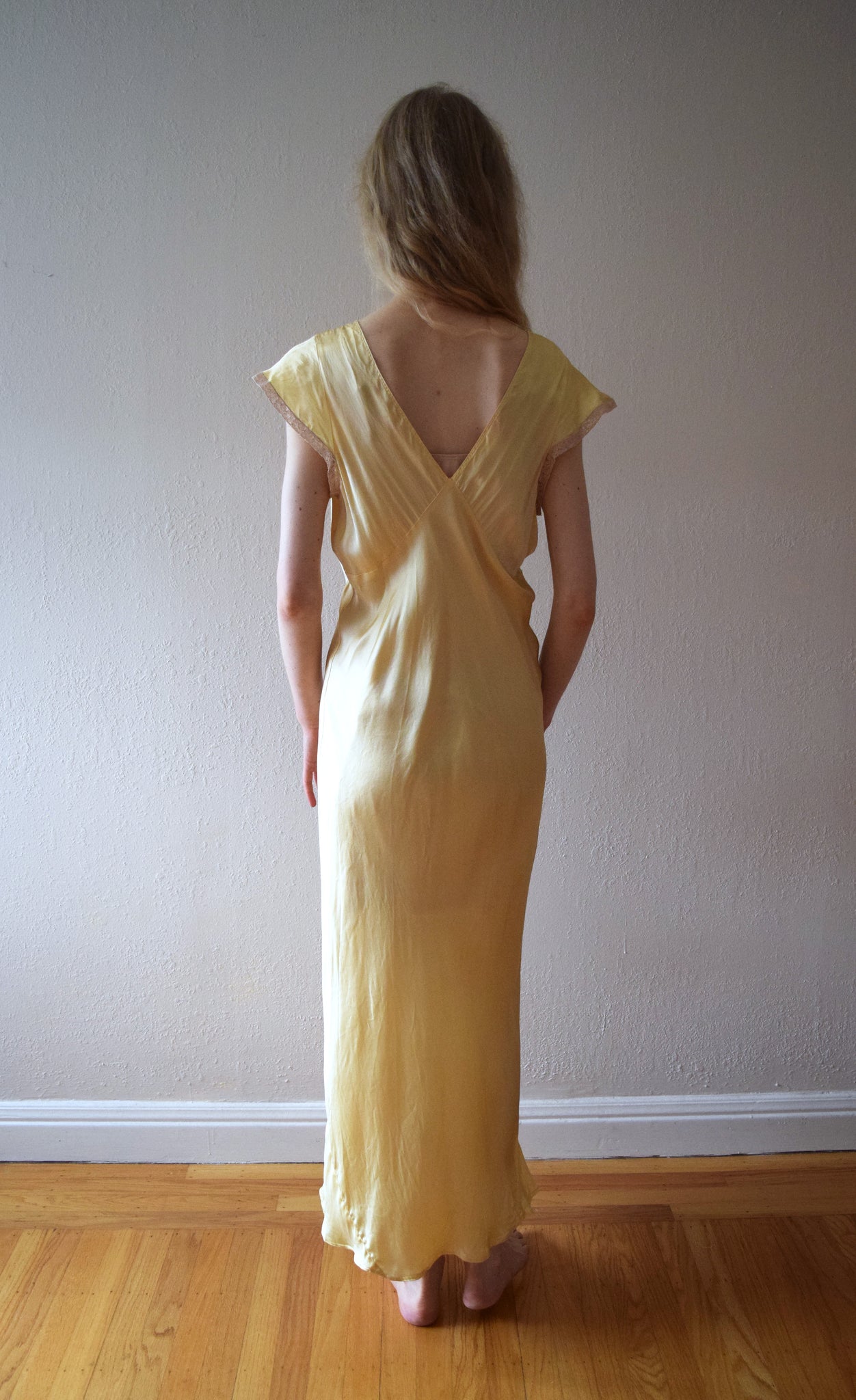 A vintage nightgown from the late 1930s to early 1940s with flutter sleeves and a lace collar. It also has lace trim on the sleeves and front bodice. The gown is bias cut, and has a keyhole opening on the front bodice with a small tie at the front neckline. The fabric is a yellow silk satin.