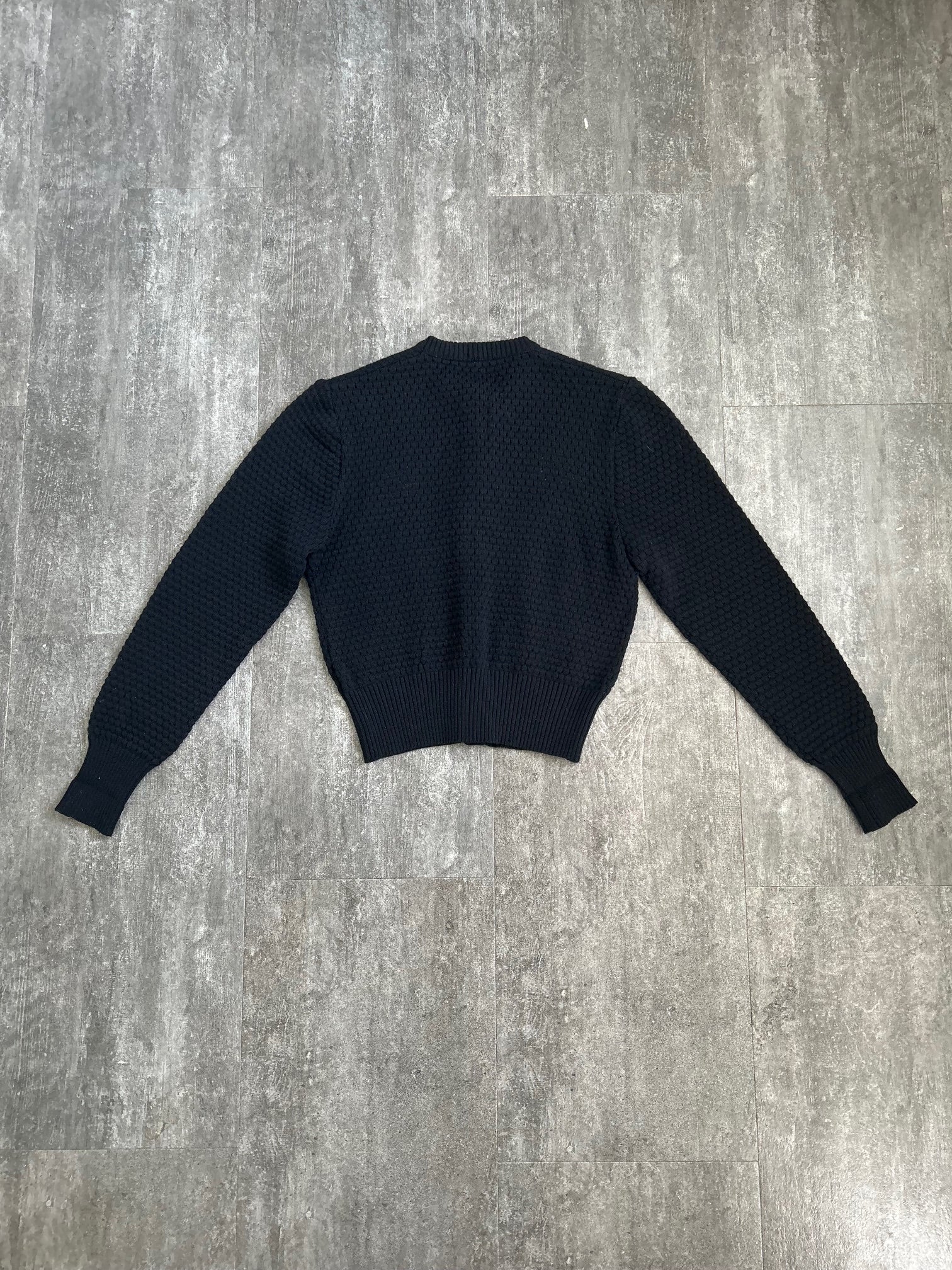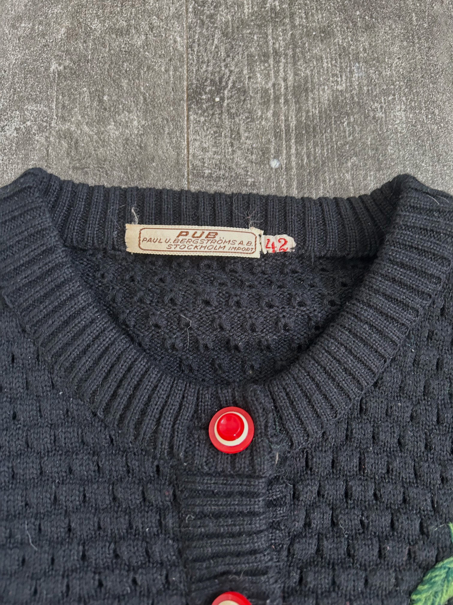 A vintage cardigan from the late 1940s/early 1950s with colorful embroidered flowers on the front bodice. The fabric is a textured wool knit. The cardigan fastens with red and cream plastic buttons down the front. The maker is "Pub."