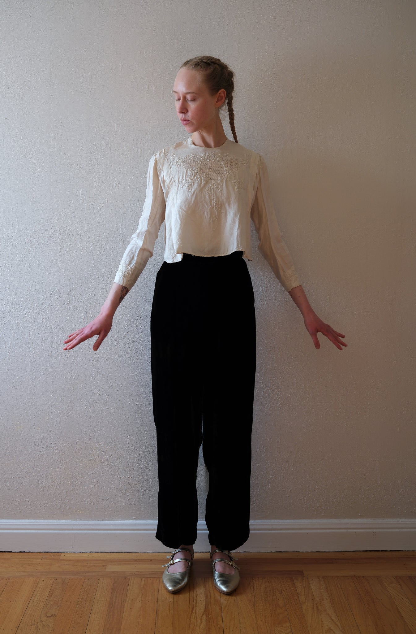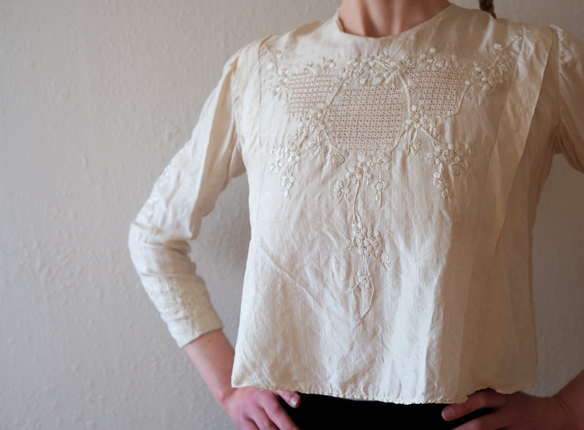 An antique (Edwardian era) raw silk blouse with beautiful cutwork and floral embroidery on the front, back, and sleeves. The top buttons up the back. The cream fabric is raw silk.