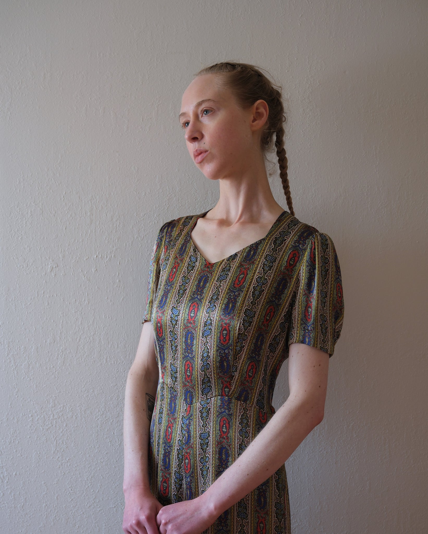 A vintage 1940s jumpsuit (possibly late 1930s, but most likely 1940s) with slightly puffed sleeves. The print fabric is a liquid rayon satin. The jumpsuit fastens with fabric-covered buttons up the back bodice and zippers at the side hips, and it also has snaps at the back waist creating a drop seat.