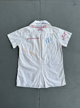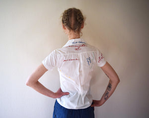 A 1930s/1940s signature blouse with colorful embroidered signatures on both the front and back. The top has a collar and a front breast pocket. The top also has an inverted pleat on the back. The top fastens with buttons down the front, and it also has a small button on each side under the collar that could be looped together with a small ribbon or tie if the wearer wanted to wear the collar shut.